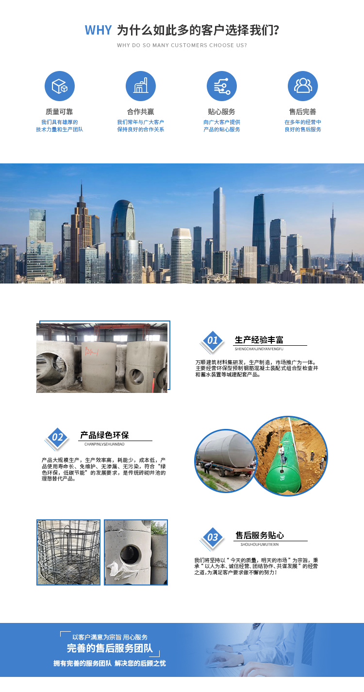 安徽萬渠建筑科技有限公司是集研發(fā),生產(chǎn)制造,市場(chǎng)推廣為一體的綜合性企業(yè)。公司主要經(jīng)營(yíng)環(huán)保型預(yù)制鋼筋混凝土裝配式組合型檢查井和蓄水裝置等城建配套產(chǎn)品。產(chǎn)品生產(chǎn)過程采用獨(dú)特的生產(chǎn)工藝,機(jī)械化流水作業(yè)。產(chǎn)品大規(guī)模生產(chǎn),生產(chǎn)效率高,耗能少,成本低,產(chǎn)品使用壽命長(zhǎng)、免維護(hù)、無滲漏、無污染,符合“綠色環(huán)保,低碳節(jié)能”的發(fā)展要求,是傳統(tǒng)磚砌井池的理想替代產(chǎn)品。